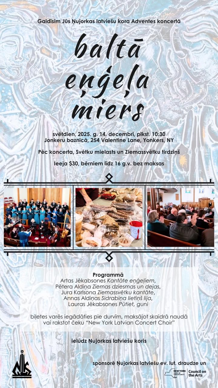 ❄️❄️❄️Tuvojas Ņujorkas latviešu kora 14. decembra koncerts "Baltā eņģeļa miers", plkst. 10.30 Jonkeru baznīcā, Ņujorkā! Ieeja $30, bērniem līdz 16.g.v. bez maksas. Programmā - Annas Aldiņas, Artas Jēkabsones, Lauras Jēkabsones, Pētera Aldiņa un Jura Karlsona skaņdarbi. Pēc koncerta: Svētku mielasts un Ziemassvētku tirdziņš >>>New York Latvian Concert Choir<<<  2025 Dec 08