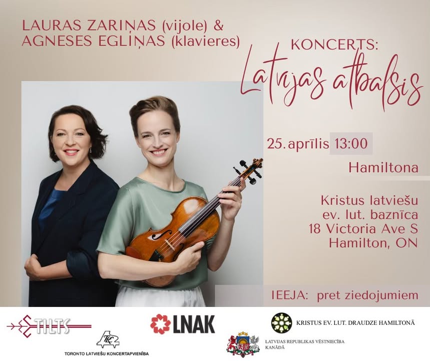 🎼🎹🎶 Priecājamies atbalstīt vijolnieces Laura Zarina un pianistes Agneses Egliņas koncertu "Latvijas atbalsis" Hamitonā, ON, sadarbībā ar Latvian National Federation in Canada/Latviešu Nacionālā Apvienība Kanadā un Kristus ev. lut draudzi Hamiltonā, Christ Latvian Evangelical Lutheran church in Hamilton. Lai skan!  2026 Feb 16